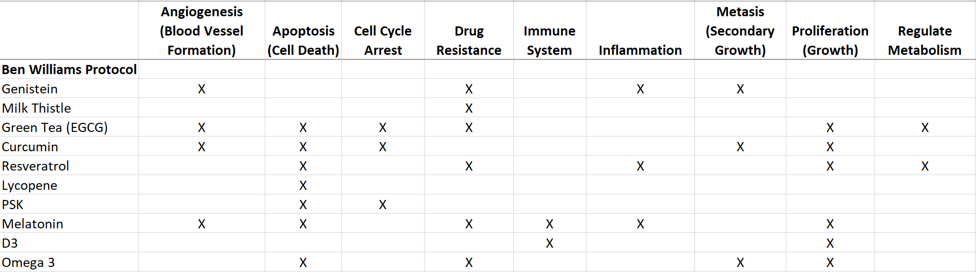 Met daarin een analyse van de supplementen van Ben Williams, dat aangeeft dat het de mogelijke groeipaden van de tumor belemmerd: